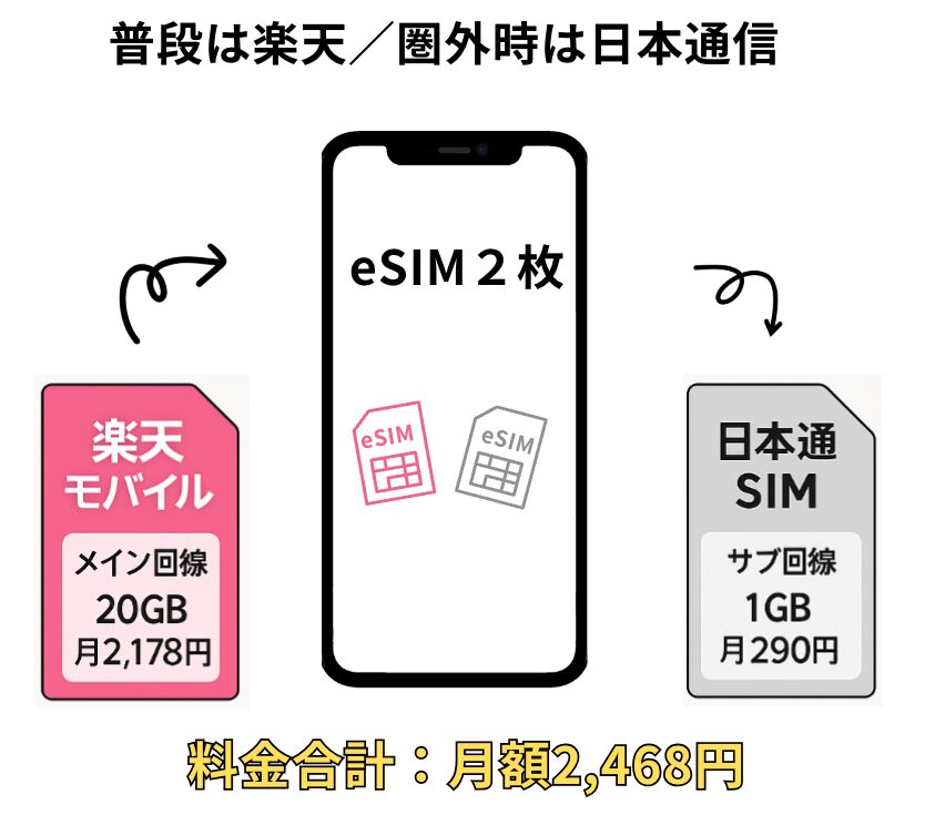 楽天モバイルの安さを享受しながら、ドコモ回線の日本通信SIMを「保険」として組み合わせることで安心感を確保しました。